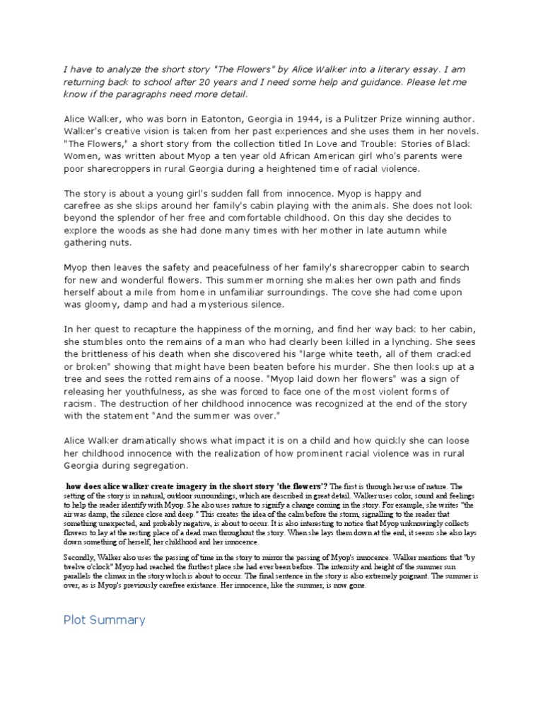The Flowers By Alice Walker Summary - The flowers by alice walker summary.. Maybe you would like to learn more about one of these? We did not find results for: The flowers by alice walker summary. Check spelling or type a new query.